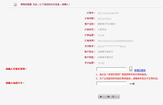 点“获得交易码”,网银关联的手机可收到一条交易短信,记下交易密码,再输入网银动态口令,点确定,显示“支付成功”。