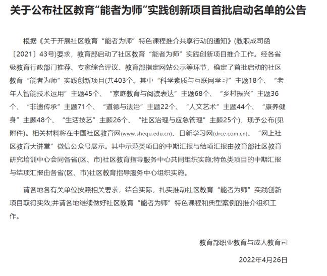 近日,教育部职业教育与成人教育司根据《关于开展社区教育 “能者为师 ”特色课程推介共享行动的通知》(教职成司函〔 2021 〕 43 号)要求,将社区教育 “ 能者为师 ” 实践创新项目首批启动名单予以公示 (共403个)。乐竞在线注册申报的《百师进千家 育万人心》入选社区教育“能者为师”实践创新示范项目(“家庭教育与阅读表达”主题)。