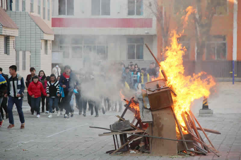 下午三点整,演练总指挥孔庆龙校长宣布应急演练开始,火警警报拉响,随后疏散引导组的老师迅速到达指定位置并大声指挥师生有秩序的进行撤离,义务消防队员迅速前往火灾现场进行灭火,医疗救护组和后勤保障组人员立即赶到教学楼前集结待命。8分钟后,5号教学楼内师生和2号实验楼内师生以及1号行政楼内的教工全部撤离到3号教学楼前操场集合。学生以班为单位,教工以处、室、系为单位迅速清点人数并向演练总指挥报告登记。参加演练的330名中专学生和94名教工全部安全撤离出教学楼和办公楼,没有出现拥挤、踩踏现象。