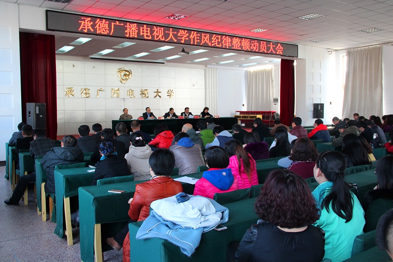 3月9日下午,承德电大召开作风纪律整顿动员大会,就“学讲话、转作风、促转型、谋发展”进行宣传部署,政协副主席、校长孔庆龙主持会议,党委书记姚钢乾作了专题讲话,副校长苏卫兵、张桂春,纪委书记杨永明及全体教职工参加动员大会。