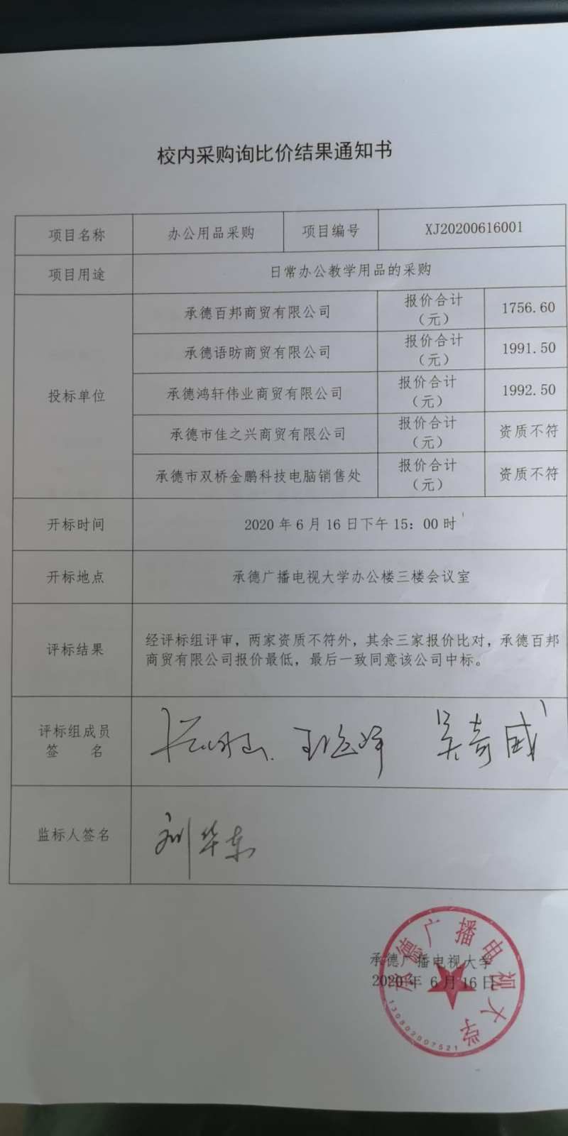 公务用车服务采购询比价结果