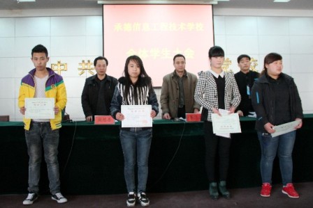 许海燕宣读了关于陈帅、宋征、张超等12名学生的通报表扬。表扬了他们服从学校安排,腾出条件好的宿舍给新生的这种顾全大局,爱护新生的精神。为在北大青鸟2014年“DIY年历”全国评选活动中荣获全国二等奖的李春玉、张艳晶、黄振三名同学和获得DIY省级优秀奖的高宏欣同学颁发了荣誉证书和奖品。