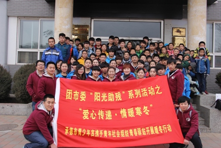 寒冬将至,团市委“阳光助残”系列活动之“爱心传递 情暖寒冬”的暖冬行动正式起航。2014年11月27日下午,乐竞在线注册10名青年志愿者参与了由共青团承德市委、承德市青少年宫携手承德市青年社会组织青春驿站到承德市特殊教育学校开展的“关爱残疾儿童 传递人间大爱”为主题的“阳光助残”暖冬行动。活动期间,乐竞在线注册师生与同学们进行了交流互动,表演了精心准备的手语《隐形的翅膀》,并为孩子们送上了智力拼图、转笔刀、酸奶、饼干等价值1500元的慰问品。